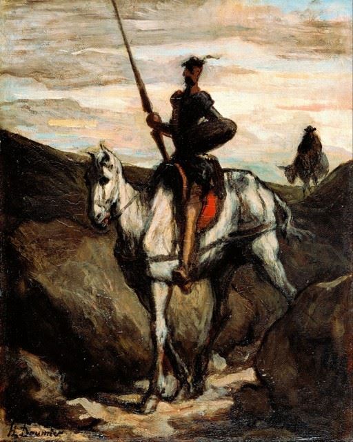 Artist: Honore Daumier - Title: Don Quixote in the Mountains - Medium: Fine Art Reproduction Giclee on Canvas - Image Size: Approximately 20 inches x 16 inches - Unframed on Unstretched Canvas - Biography: Honore Daumier, in full Honore-Victorin Daumier, (born February 20/26, 1808, Marseille, France--died February 11, 1879, Valmondois), prolific French caricaturist, painter, and sculptor especially renowned for his cartoons and drawings satirizing 19th-century French politics and society. His paintings, though hardly known during his lifetime, helped introduce techniques of Impressionism into modern art.