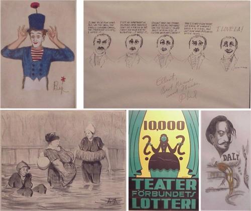 Honore Daumiere and others (five) BATHERS as published in Chari Vari, lithograph, initial in the plate, image 7 1/2 x 9 1/2"; together with two etchings by George Crionas, each signed and numbered; a caricature print signed by Phil Messing, all framed with glass; together with European Lottery Poster signed by Schwab, 38 1/2 x 27" mounted to board, in C condition. (5)