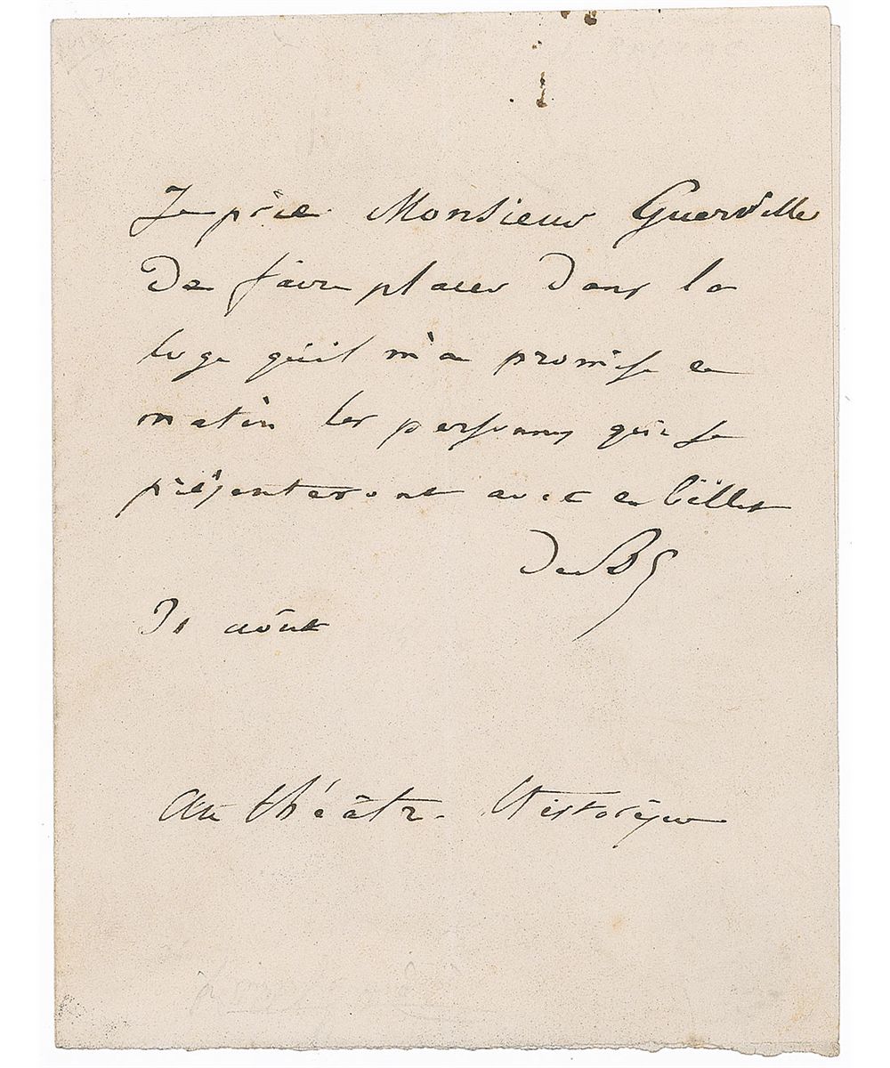 Scarce ALS in French, signed “de Bc,” one page, 4 x 5.25, August 31, [1848]. Letter to Paul Guerville at the “Theatre Historique.” In part (translated): “I kindly ask Monsieur Guerville to seat the persons holding this letter in the box he has promised me this morning.” In fine condition, with a central vertical fold. Just the second Balzac letter we have ever seen.
