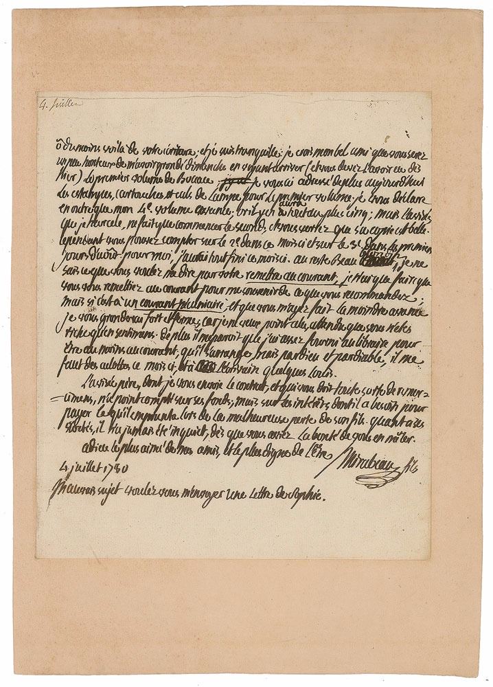 Controversial leader of the early stages of the French Revolution (1749-1791). Rare ALS in French, signed “Mirabeau fils,” one page, 7.25 x 8.75, July 4, 1780. Letter to an unnamed friend, in part (translated): "O at least that's your writing; and I am quiet; I see my good friend that you will be a little ashamed for scolding me on Sunday when you see (and you must have had yesterday) the first volume of Boccaccio. I sent you today more prints, cartridges and lamp ends for the first volume…I further declare that my fourth volume is advancing; but there will be no more than five…However you can count on the 2nd in this month and on the 3rd in the first days of August. For me, I would have finished all this month…I do not know what you want to tell me by your update; I do not want you to forget about what you recommend; but if it is a pecuniary current and you have made me the slightest advance I will scold you loudly and firmly; for I do not want that, since you are rich only in feelings. Besides, it seems to me that I have sufficiently supplied the bookseller to be at least informed; let him arrange, but by god and devil, I need panties this month." Affixed by the left edge to a slightly larger sheet. In fine condition.