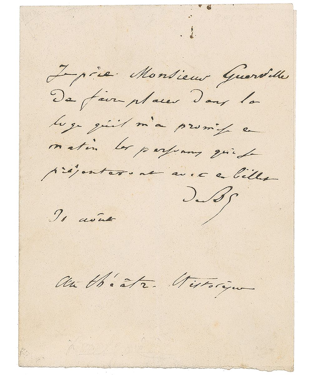 Prolific and important French novelist and playwright (1799–1850) best known for his complex ‘cycle’ La Comédie humaine. Scarce ALS in French, signed “de Bc,” one page, 4 x 5.25, August 31, [1848]. Letter to Paul Guerville at the “Theatre Historique.” in part (translated): “I kindly ask Monsieur Guerville to seat the persons holding this letter in the box he has promised me this morning.” In fine condition, with a central vertical fold. Just the second Balzac letter we have ever seen.
