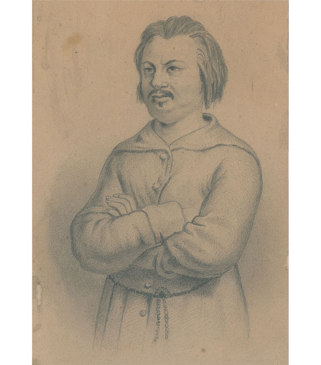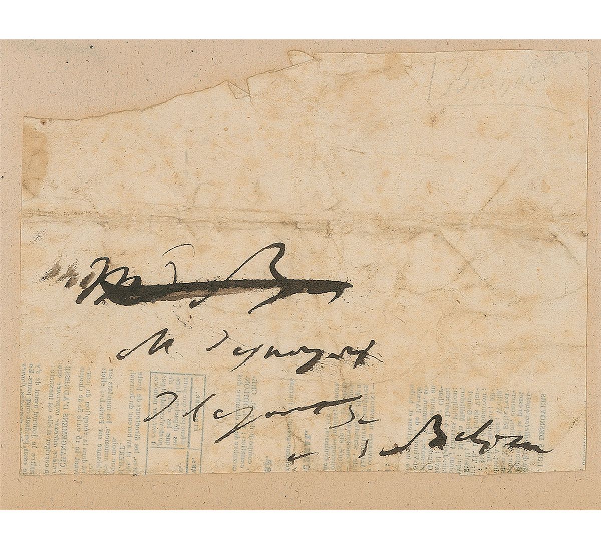 Rare and bold ink signature, “M. B., M. Desnoyer, Reponse, Balzac,” on an off-white 5.25 x 4 sheet affixed to a slightly larger card. In very good condition, with moderate to heavy overall creasing, wrinkling, and soiling. Accompanied by an original pencil sketch portrait of Balzac by an unknown artist.