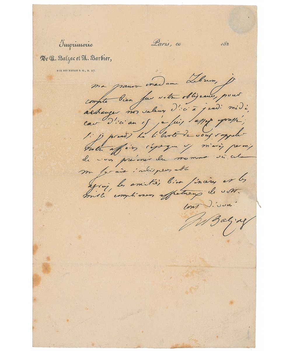 Important French novelist and playwright (1799–1850) best known for his complex ‘cycle’ La Comédie humaine. ALS in French, signed “H. Balzac,” one page, 5.25 x 8, personal letterhead, no date but circa 1827. Letter to Madame Lebrun. In part (translated): “I count on your kindness to share our values by Thursday noon, because by 15 I'm pretty pressed; if I take the liberty to remind you of our case...you allowed me to notify you when it is essential to me.” In very good condition, with scattered foxing and staining. This letter appears in Balzac’s collected correspondence, edited by Roger Pierrot, Hervé Yon, Vol. I, No. 27-20, p. 208. This dates to early in Balzac’s career during a period of relative anonymity—although he had published nine novels by 1826, all were written under pseudonyms and often the result of a collaborative effort. It was not until the early 1830s that he began to consider the idea of an organized series of works, which would develop into the incredible Comédie humaine—as one of the most ambitious literary projects ever conceived, by the end of his life Balzac had completed 91 finished works in the series, alongside dozens left unfinished. A highly desirable letter from one of the figureheads of French literature.