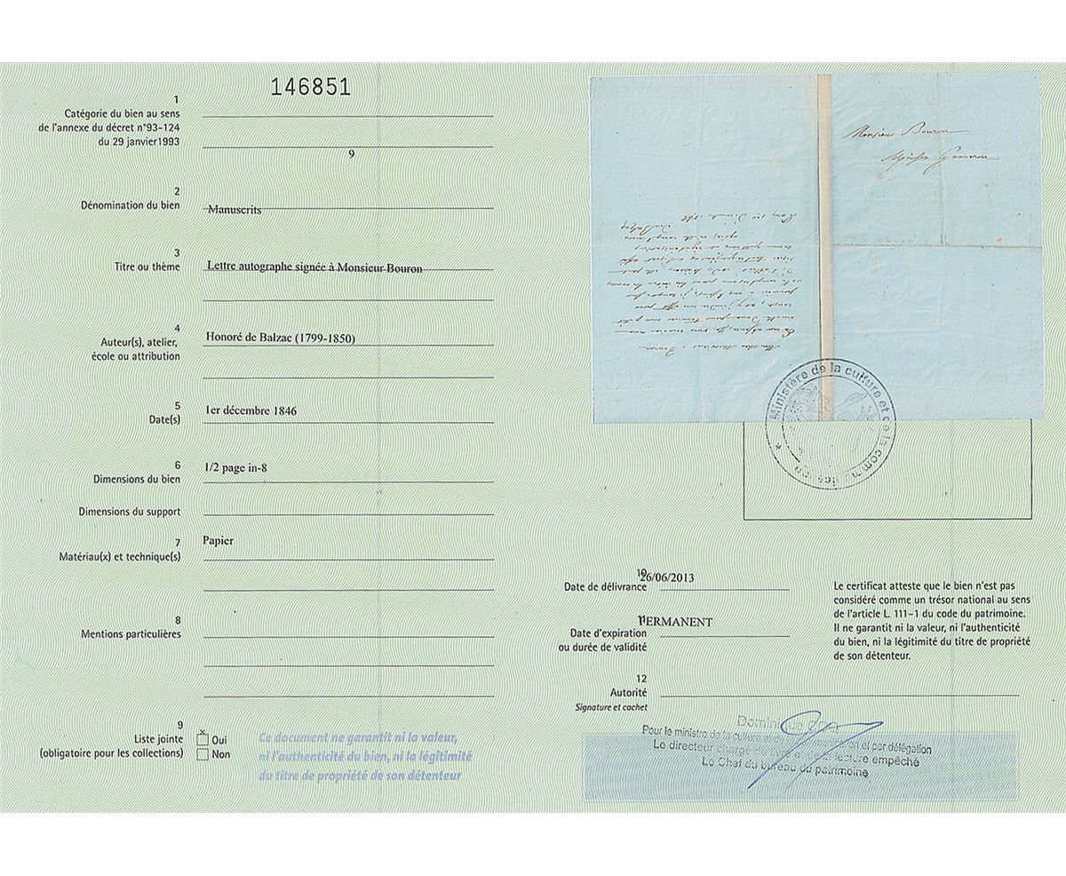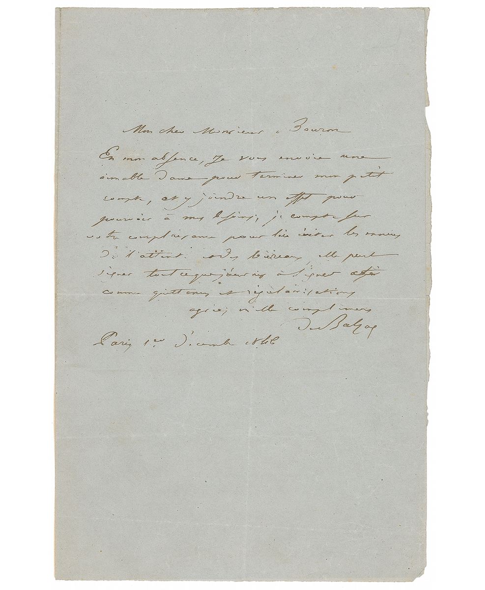 ALS in French, signed “de Balzac,” one page, 5.5 x 8.5, December 1, 1846. Letter to “My dear Mr. Bouron,” in full (translated): “While absent, I am sending a kind lady to settle my small account, and enclosing with it a bill [payable to bearer] to provide for my needs; I am counting on your kindness to prevent bureaucracy waiting annoyance, she can sign all I would have to sign…as receipt and regularization.” In fine condition, with intersecting folds and light overall creases. Accompanied by an export certificate from the French Ministry of Culture. The year 1846 marked the publication of Balzac’s last great work, La Cousine Bette, another installment of his prodigious La Comedie humaine. Plumbing the depths of vice and virtue, Cousin Bette is one of the 18th century’s realist masterpieces and has drawn comparisons to Shakespeare's Othello and Tolstoy's War and Peace. Rather uncommon, Balzac’s letters are of the utmost desirability.