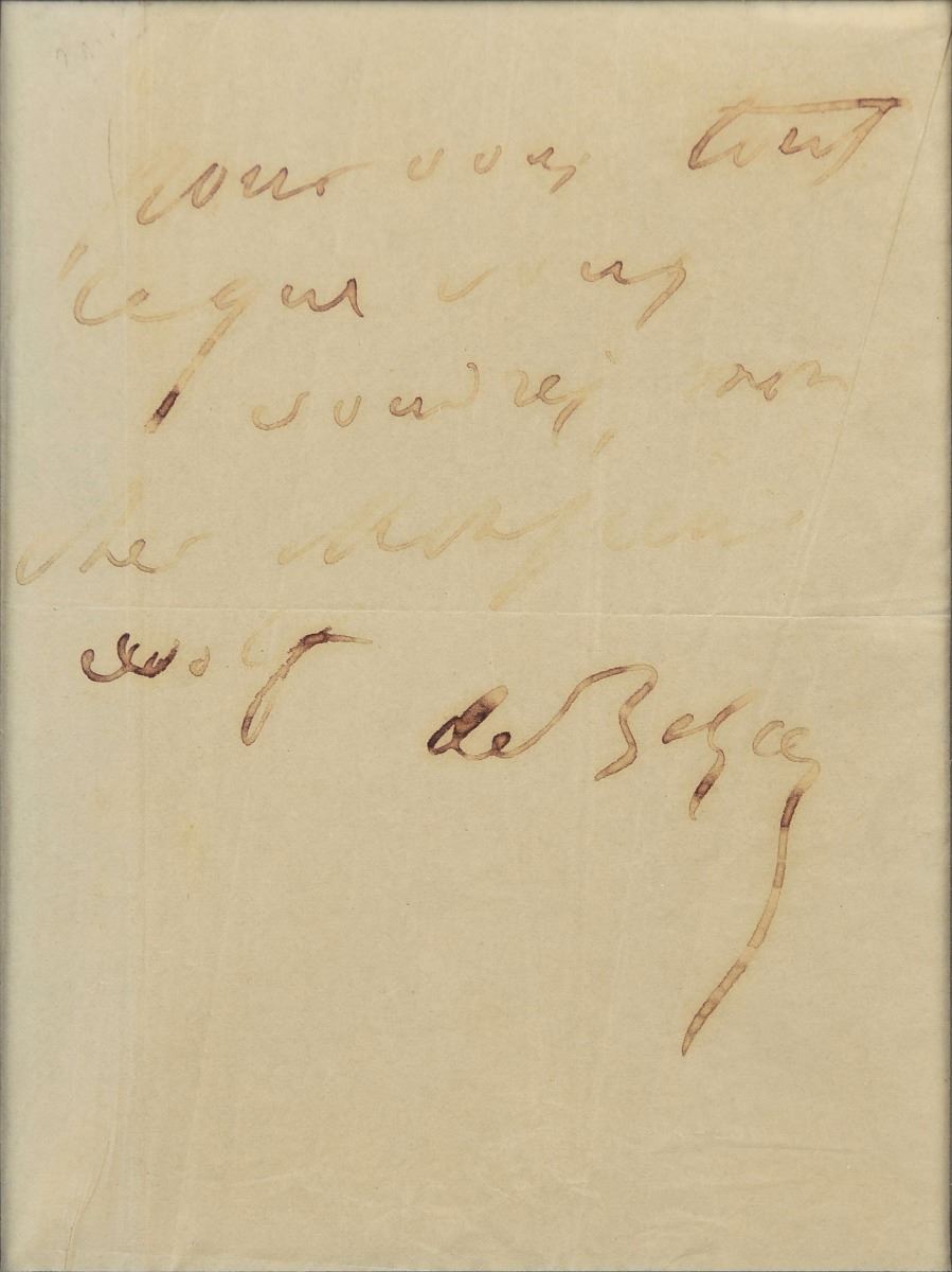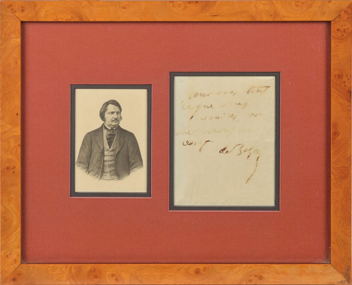 Prolific and important French novelist and playwright (1799–1850) best known for his complex ‘cycle’ La Comedie Humaine. ANS in French, signed “de Balzac,” one page, 3.75 x 4.75, no date. In full (translated): "For you all what you want, my dear Mister Wolf." Double-matted and framed with an engraved portrait to an overall size of 13 x 10.5. In very good to fine condition, with light overall creasing and the ink somewhat faded but almost entirely legible.