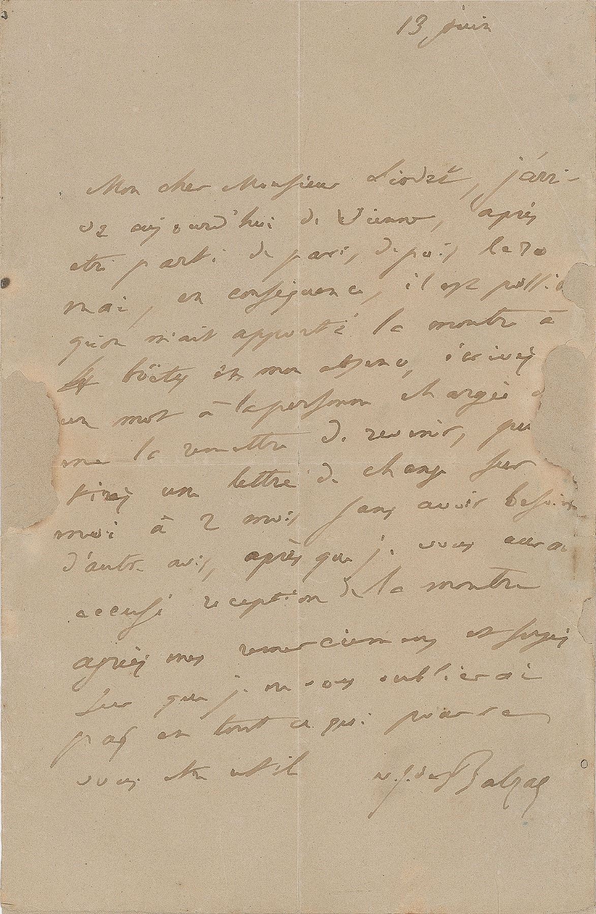 Prolific and important French novelist and playwright (1799–1850) best known for his complex 'cycle' La Comédie humaine. ALS in French, one page, 5.25 x 8.25, June 13, [no year, but docketed 1835 on the reverse]. Letter to Monsieur Liodet. In full (translated): "I have arrived today from Vienna after having left Paris on May 20. Therefore, it may be possible that someone has brought me the clock during my absence. Please write a word to the person and I will send you a bill of change for two months. I will need another after I will have confirmed the reception of the clock. Agree my thanks and please remember I will never forget you and ask me anything in which I can be of use." In very good to fine condition, with repairs to paper loss at edges. The consignor notes that this letter was sold to a Brazilian collector in the 1940s, and that it has been off the market for seventy years. An extraordinary resurgence of Balzac's letter about the clock, boasting a rare, longer variation of his signature than typically seen.