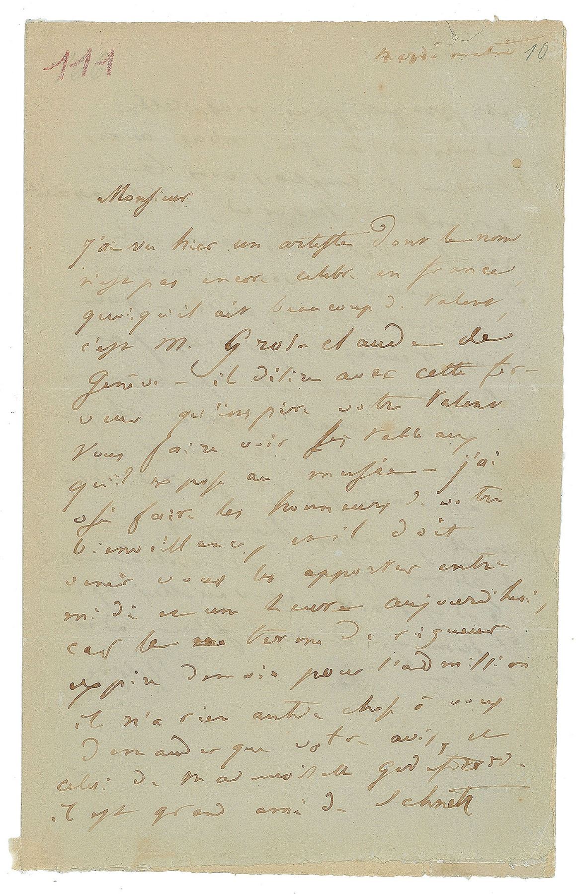 Desirable ALS in French, signed “de Balzac,” one page both sides, 5.25 x 8.25, [circa February 1835]. Letter of recommendation to Baron Gerard for the Swiss painter Louis-Aime Grosclaude, in part (translated): "Yesterday I saw an artist whose name is not famous in France yet, although he has great talent, it is M. Gros-Claude of Geneva. He desires…to show you his paintings, which he exhibits at the museum…he has nothing else to ask of you but your opinion, and that of Mademoiselle Godefroid. He is a great friend of Schnetz." In fine condition, with a few small pieces of archival tape along the edges, and old mounting remnants along the back of the hinge. Louis-Aime Grosclaude (1784–1882) was a student of Jean-Baptiste Regnault, and exhibited at the Paris Salon since 1833. Balzac had made his acquaintance in Geneva the previous year; Gerard would later write to Balzac that Grosclaude was 'quite simply a man of talent.' Published in Balzac, Correspondance I, Bibliotheque de la Pleiade, no. 35-21.