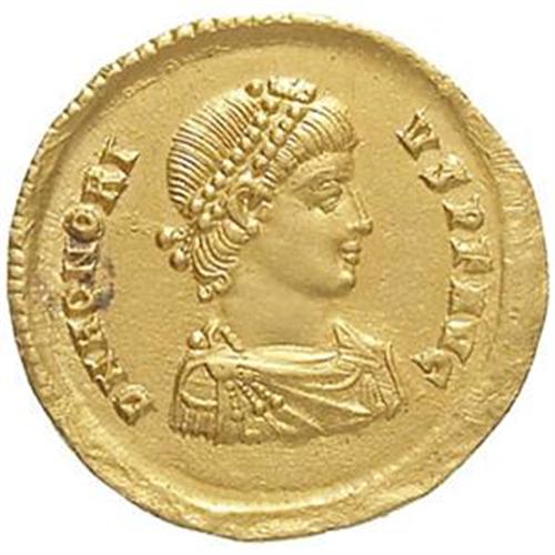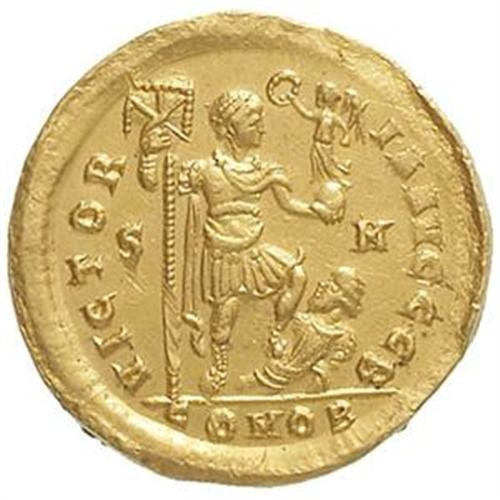 Roman Empire Coins. Honorius (393-423). Solido, 393-395. Constantinople. D/ DN HONORIVS P F AVG. Busto diademato a destra. R/ VICTORIA AVCCCB. L'imperatore, stante a destra, tiene labaro e globo sormontato da Vittoria, mentre con il piede sinistro calpesta un prigioniero. Nel campo, S-M. In esergo: COMOB. LRC 693 var. (manca con officina B). RIC (Arcadius) 2. gr. 4.47 RRR. AU. Insignificante segnetto al R/, altrimenti SPL. La prima emissione, molto rara, al nome di Honorius. Per l'attribuzione dei solidi con S-M a Constantinople e non a Sirmium, vedi LRC, pp. 119-120 e 196.