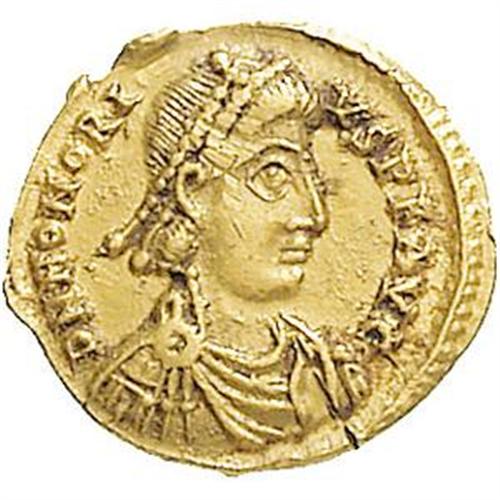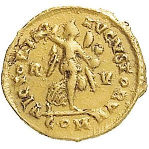 Roman Empire Coins. Honorius (393-423). Tremisse, Ravenna. D/ Busto diademato a destra. R/ VICTORIA AVGVSTORVM. La Vittoria avanza a destra con corona e globo crucigero. Nel campo, R-V. In esergo: COM. Cfr. LRC 737. gr. 1.49 RR. AU. Bel BB+/BB.