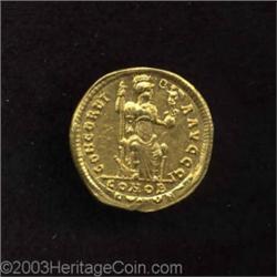 <TABLE cellSpacing=0 cellPadding=0 width="100%" bgColor=#000000 border=0><TBODY> <TR><TD width="100%"><TABLE cellSpacing=1 cellPadding=3 width="100%" border=0><TBODY><TR><TD width="100%" bgColor=#79735c><FONT face=arial color=#ffffff size=3><B>Description</B> </FONT></TD></TR><TR><TD width="100%" bgColor=#ffffff><FONT face=arial size=2><B>Honorius.</B></I> A.D. 393-408. AV solidus (20 mm, 4.31 g). Constantinople, A.D. ca. 403-408. Diademed, helmeted and cuirassed three-quarter bust facing slightly right, holding spear over right shoulder and on left arm shield decorated with a horseman spearing fallen enemy / Constantinopolis enthroned facing, head right, right foot on prow, holding sceptre in right hand, Victory on a globe in left; I/CONOB. RIC 30; Depeyrot 55/2. Nice VF, graffiti in fields. Perhaps previously mounted. </FONT></TD></TR></TBODY></TABLE></TD></TR></TBODY></TABLE><BR><A name=PricesRealized></A><TABLE cellSpacing=0 cellPadding=0 width="100%" bgColor=#000000 border=0><TBODY><TR><TD width="100%"><TABLE cellSpacing=1 cellPadding=3 width="100%" border=0><TBODY><TR><TD width="100%" bgColor=#79735c><A name=PR><FONT face=arial color=#ffffff size=3><B>Previous Prices from Heritage Auctions</B> </FONT></A></TD></TR><TR><TD bgColor=#f6f6ed>No Prior Data Recorded </TD></TR><TR><TD bgColor=#ffffff><FONT face=arial size=1 ?>PLEASE NOTE: All prices realized reflect the final hammer price PLUS the buyer's premium in auctions that charge a buyer's premium. Each item has a notation at the top of the listing indicating whether that lot included a buyer's premium. Example: A item that sells with a final hammer price of $100 and a 20% buyer's premium will display with a price realized of $120. All information listed is intended to be as accurate as possible, but errors are possible. Please use this guide carefully and inform us of any inaccuracies. </FONT></TD></TR></TBODY></TABLE></TD></TR></TBODY></TABLE><BR><TABLE cellSpacing=0 cellPadding=0 width="100%" bgColor=#000000 border=0><TBODY><TR><TD width="100%"><TABLE cellSpacing=1 cellPadding=3 width="100%" border=0><TBODY><TR><TD width="100%" bgColor=#79735c colSpan=6><FONT face=arial color=#ffffff size=3><B>Price Guide*</B> </FONT></TD></TR><TR bgColor=#f6f6ed><TD align=middle><B>Grade</B> </TD><TD align=middle><B>Coin World<BR>(Trends)</B> </TD><TD align=middle><B>Numismedia<BR>Retail</B> </TD><TD align=middle><B>Numismedia<BR>Wholesale</B> </TD><TD align=middle><B>Coin<BR>Universe</B> </TD><TD align=middle><B>Heritage<BR>Value Index</B> </TD></TR><TR bgColor=#ffffff><TD colSpan=6><FONT size=1>*All information listed is intended to be as accurate as possible, but errors are possible. No item may be returned or refused based on this information which is provided as a service to our customers. You should contact each pricing source directly to determine the accuracy of this information. </FONT></TD></TR></TBODY></TABLE></TD></TR></TBODY></TABLE><BR><TABLE cellSpacing=0 cellPadding=0 width="100%" bgColor=#000000 border=0><TBODY><TR><TD width="100%"><TABLE cellSpacing=1 cellPadding=3 width="100%" border=0><TBODY><TR><TD width="100%" bgColor=#79735c><FONT face=arial color=#ffffff size=3><B>Population Guide</B> </FONT></TD></TR><TR bgColor=#ffffff> Important notice: Heritage usually auctions material at the rate of 200-250 lots per hour. On some occasions eBay Live bid software or the Internet may not be able to keep up with the pace of the auction. We recommend placing a realistic absentee bid now as insurance to avoid disappointment. Occasionally the auctioneer may eliminate or reject an eBay Live bid, and the auctioneer may also reopen a lot after the close of the eBay live bidding (usually because we missed an audience bid), and may reject your bid even if it shows you as the winning bidder. By bidding via eBay Live, you agree that Heritage may award the lot to another bidder at its sole discretion under the circumstances described above or any other reasonable circumstances. Also please note that all Heritage lots purchased through eBay Live carry a 20% Buyer's Premium. Please make sure you read the Terms and Conditions before you bid.</TD></TR></TBODY></TABLE></TD></TR></TBODY></TABLE>