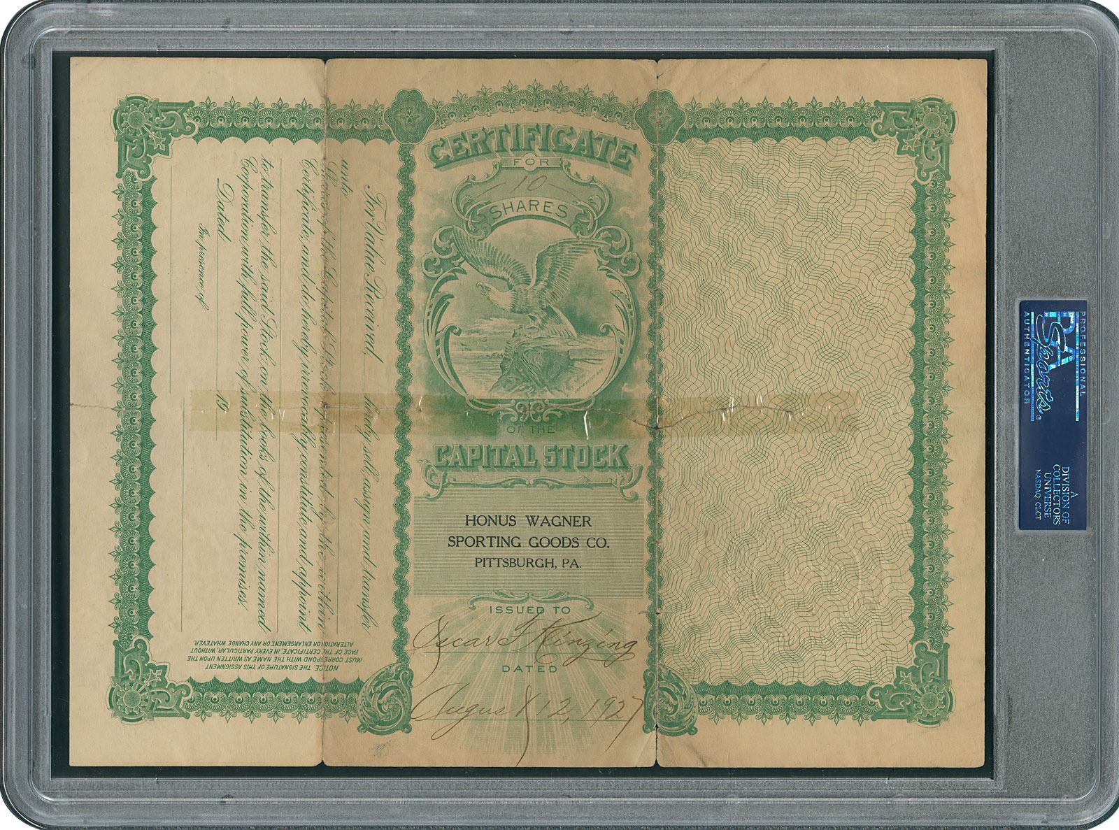 Partly-printed contract, signed “John H. Wagner,” one page, 10.75 x 8.25, August 12, 1927. Stock certificate for ten shares in the Honus Wagner Sporting Goods Co. issued to Oscar F. Klinzing, signed at the conclusion by Honus Wagner as president and countersigned by James L. Orris as treasurer. In very good condition, with partial splits to folds, with one horizontal split reinforced with toned tape on the reverse. An interesting sport-related piece from Wagner's post-playing career in business. Authenticated and encapsulated by PSA/DNA.