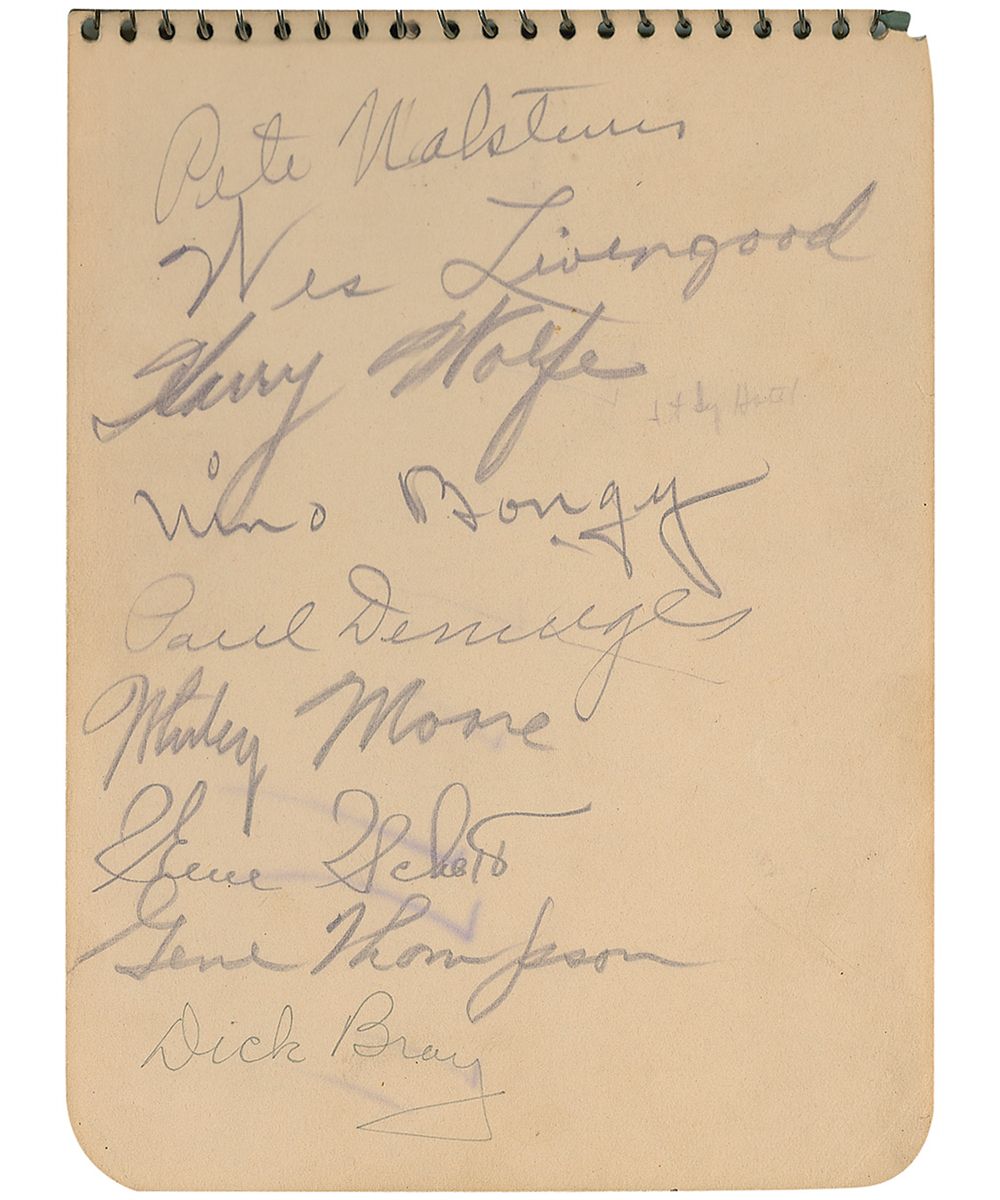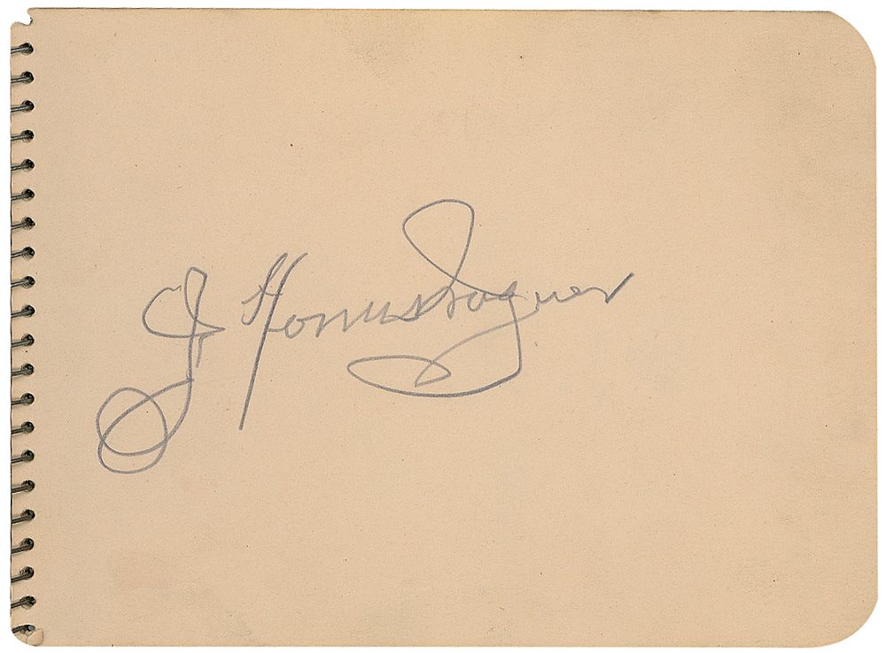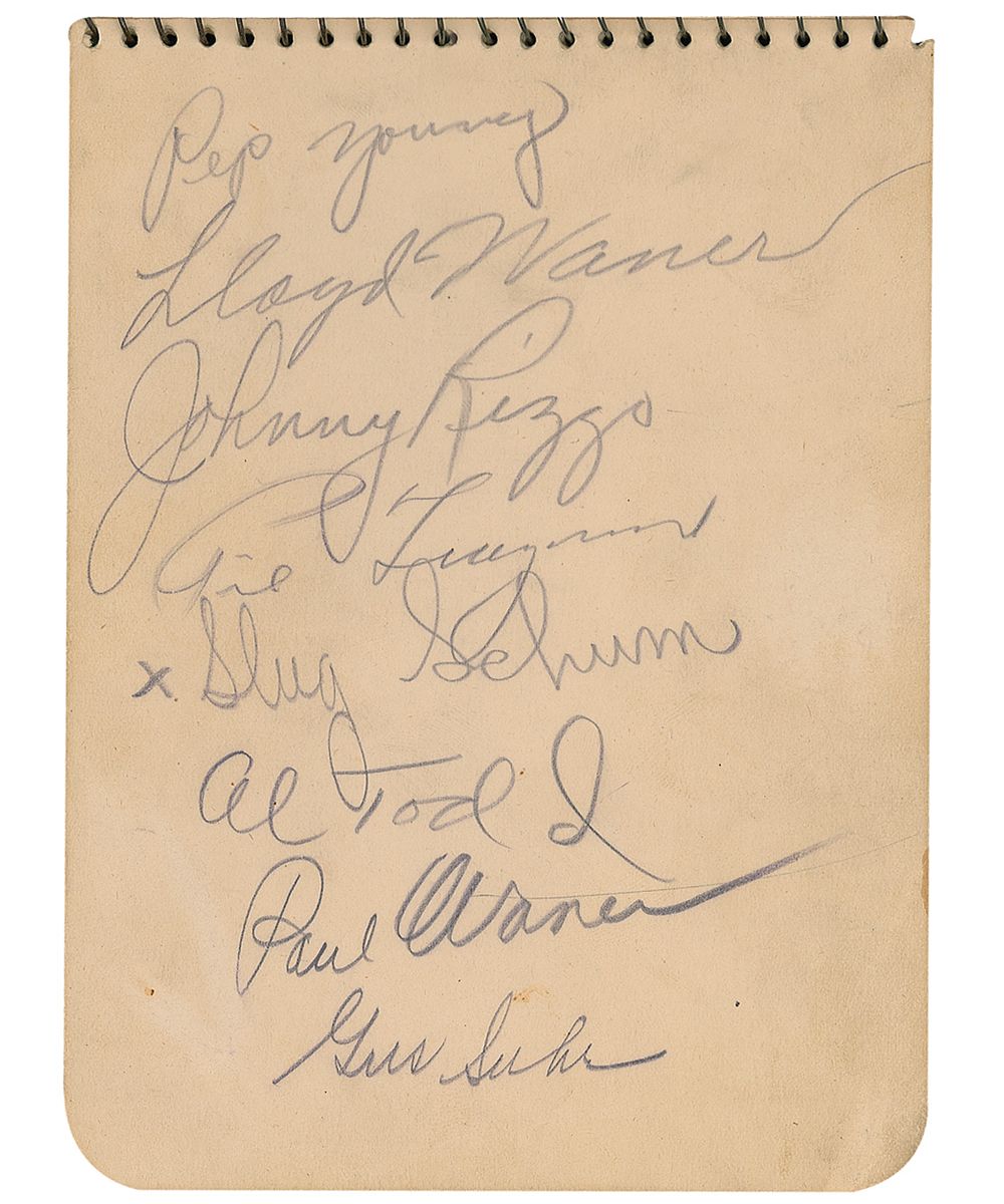Vintage softcover autograph album, 6 x 4.5, signed inside in pencil by 52 former ball players, with most pages multi-signed. Signers include: J. Honus Wagner (single page), Pie Traynor, Paul Waner (2), Lloyd Waner, Edd Roush, Ival Goodman (2), Les Scarsella, Pep Young, Johnny Rizzo, Slug Schum, Al Todd, Bucky Walters, Whitey Moore, Dick Bray, and Paul Derringer. Scattered toning and soiling to pages, otherwise fine condition. An interesting assortment of players including several Hall of Famers.