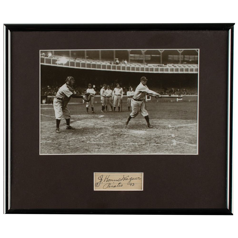 Vintage fountain pen signature, "J. Honus Wagner, Pirates 43,†on a 2.25 x .75 slip, matted and framed with a photo of him at bat to an overall size of 11 x 9. In fine condition.