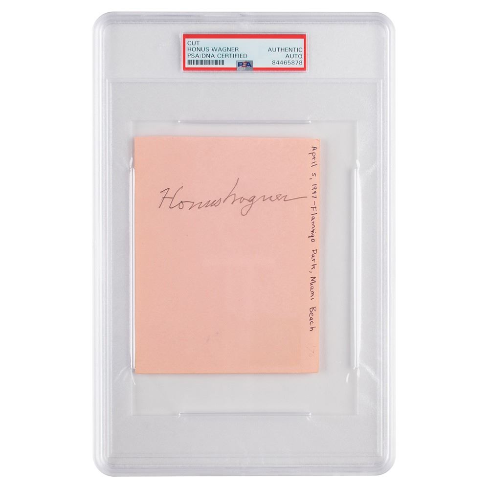 Desirable pencil signature, "Honus Wagner,†on a pink 4 x 5 album page, annotated along the top by the collector: "April 5, 1947 - Flamingo Park, Miami Beach." In very fine condition. Encapsulated in a PSA/DNA authentication holder. At this time, Wagner was coaching for the Pittsburgh Pirates as they wrapped up spring training at Flamingo Field.