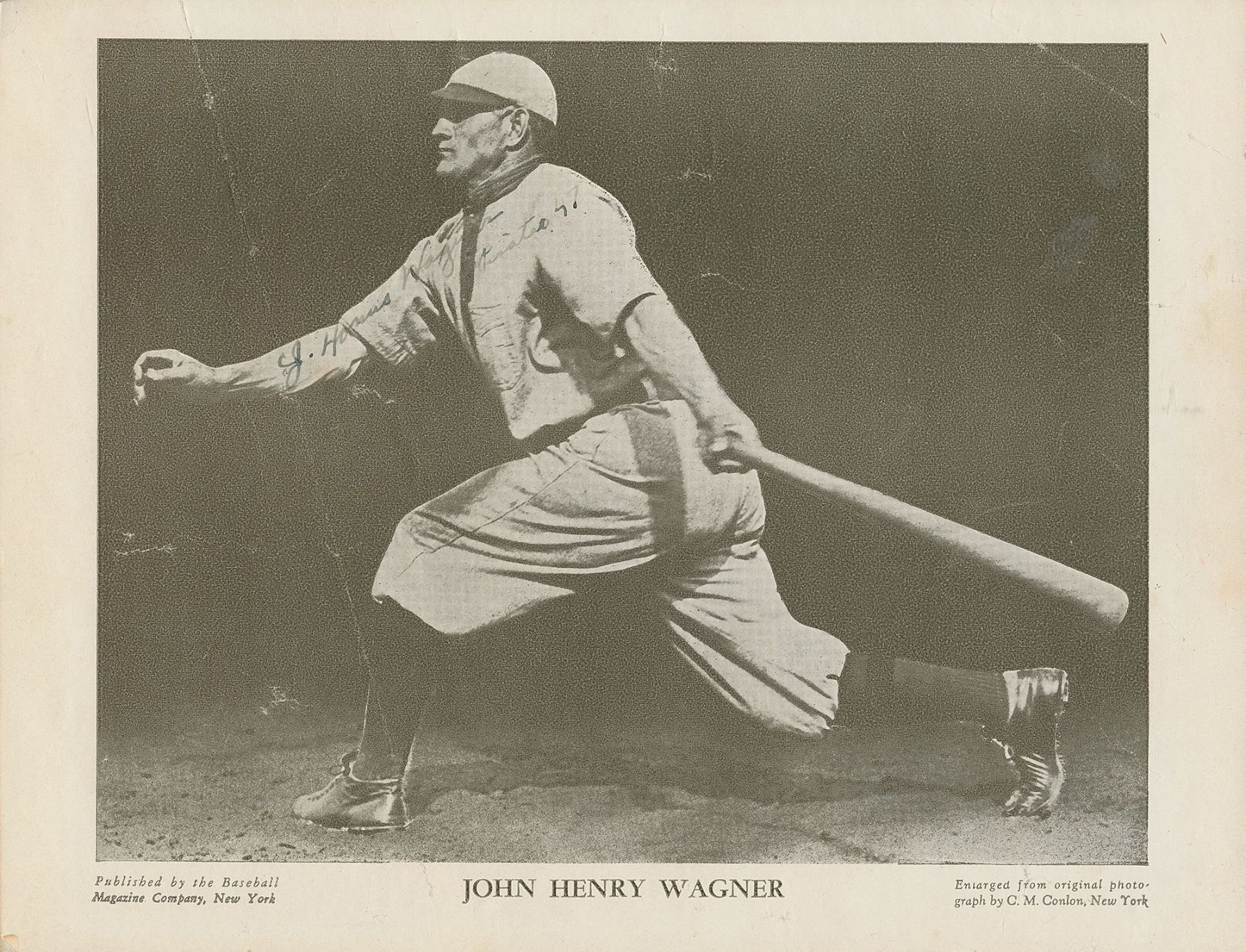 Vintage M114 Baseball Magazine premium of Wagner in a full-length post-swing pose, 9.75 x 8.25, signed along his arm and chest in fountain pen, "J. Honus Wagner, Pirates 47." Double-matted and framed with a descriptive caption to an overall size of 18 x 20.25. In very good condition, with scattered light creasing, a diagonal crease just touching the "J", and the ink just a shade light but fully legible.