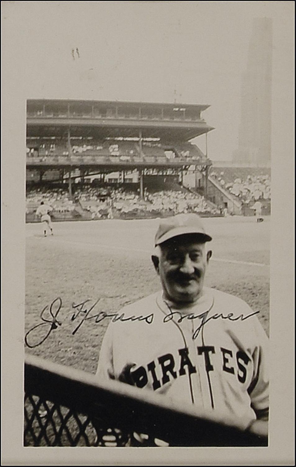 Shortstop and manager, widely regarded as one of the best all-around players of his era, he was one of the five original inductees into the Hall of Fame in 1936. Vintage glossy 2.75 x 4.5 candid photo of Wagner along the outfield fence in his Pirates uniform, signed in black ink, “J. Honus Wagner.” Matted and framed to an overall size of 10 x 12. A few light bends and creases, silvering to darker areas of bottom portion of image, and some slight irregular ink adhesion to signature, otherwise fine condition. A one-of-a-kind image of one of the Hall of Fame’s ‘First Five.’