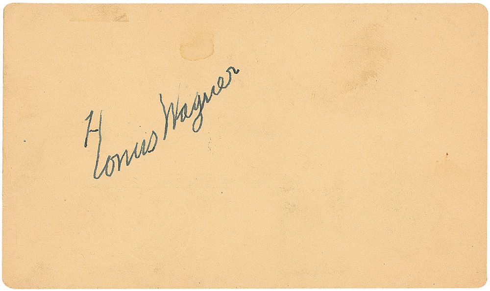 Fountain pen signature, “Honus Wagner,” on an unused off-white 5.5 x 3.25 government postcard. Scattered soiling and impressions and light creasing to corner tips, otherwise fine condition.