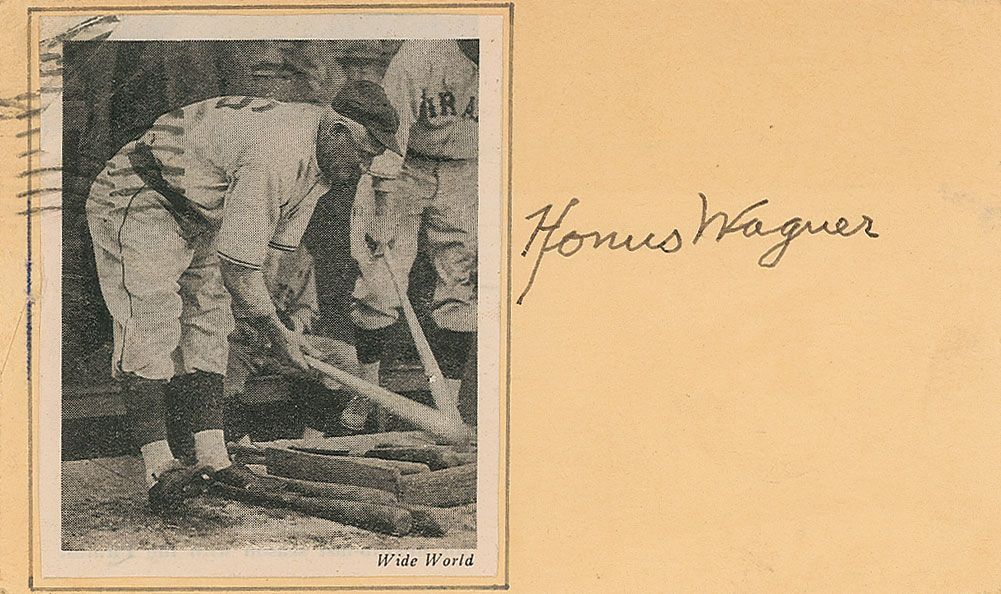 Vintage fountain pen signature, “Honus Wagner,” on an off-white 5.5 x 3.25 government postcard bearing an affixed magazine photo. In fine condition.