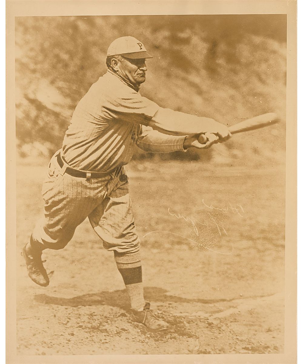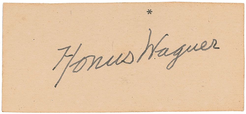 Vintage ink signature, “Honus Wagner,” on an off-white 3.5 x 1.5 card. In fine condition. Accompanied by an unsigned photo of Wagner swinging.