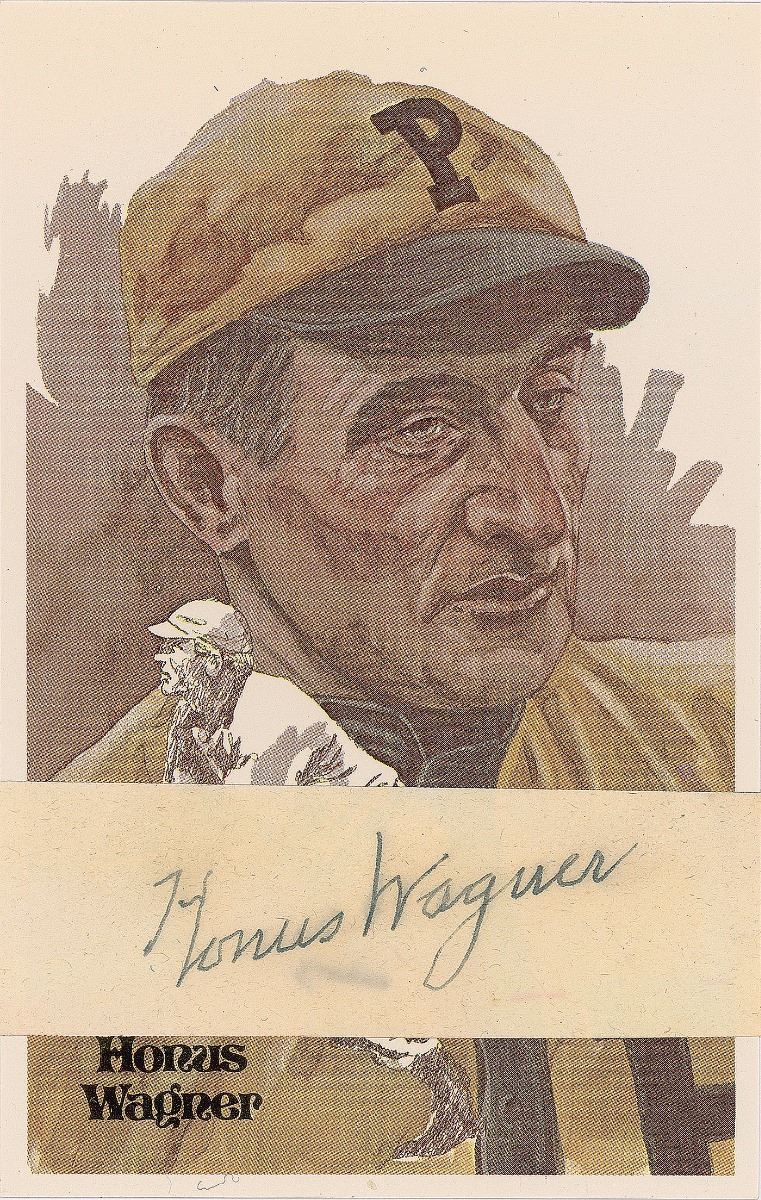 Ink signature, “Honus Wagner,” on an off-white 3.5 x 1 slip affixed to a color 3.5 x 5.5 postcard from Perez-Steele Galleries. In fine condition.
