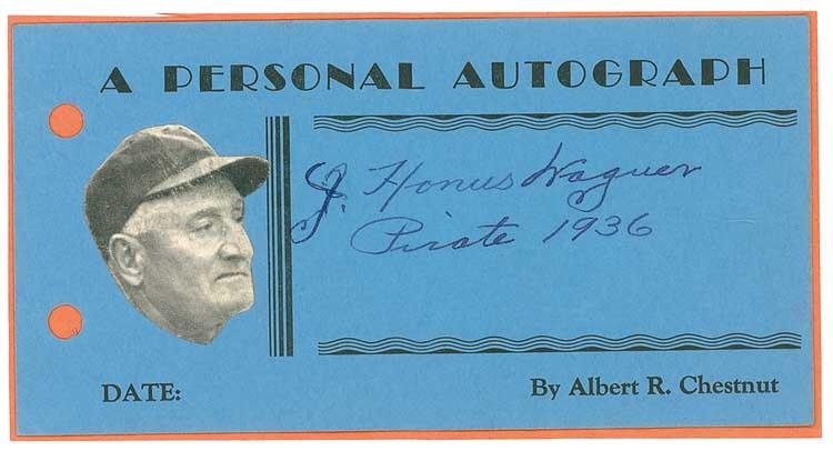 Shortstop and manager, widely regarded as one of the best all-around players of his era, he was one of the five original inductees into the Hall of Fame in 1936. Vintage fountain pen signature, “J. Honus Wagner, Pirate 1936,” on a 5.5 x 2.75 blue card from the Albert R. Chestnut collection. In fine condition, affixed to a slightly larger orange-colored sheet, with a small photo attached to the left blank area. From his Pennsylvania home, Chestnut, a printer by profession, began collecting autographs in 1935. He sent these personally-printed cards to over a thousand celebrities and received favorable replies from the vast majority, finally retiring from collecting to raise his family when postage increased from 2¢ per card! Pre-certified Steve Grad/PSA/DNA and RRAuction COA.