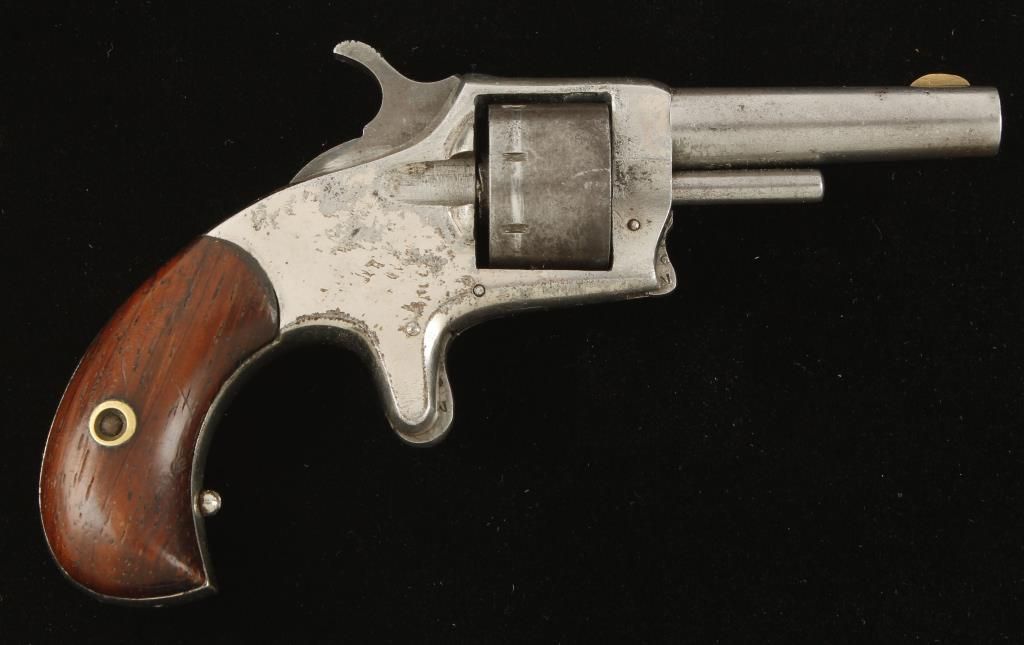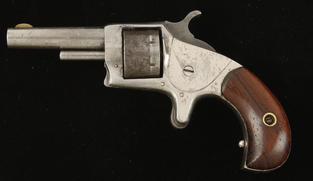 Small frame single action spur trigger solid frame revolver circa 1880's with 2-1/4" round barrel. Nickel finish, walnut birdshead grips and fixed sights. Top of barrel marked "Alert-1874". Good markings and good working action. Condition: Good overall showing light pitting on frame and grips are very good showing no loss. *Antique Firearm*