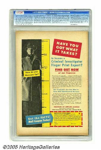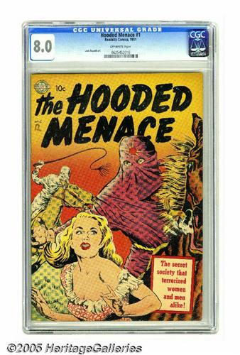<B>Hooded Menace #1 (Realistic Comics, 1951) CGC VF 8.0 Off-white pages.</B></I> This unusual one-shot might look like typical exploitation fare from the mind of a comic book artist, but as Overstreet notes, it's "based on a band of hooded outlaws in the Pacific Northwest, 1900-1906." The issue is a "Gerber "7", and our offering is the only copy certified with a grade above VG+ by CGC to date. Overstreet 2005 VF 8.0 value = $293. CGC census 3/05: 1 in 8.0, none higher. <I>From the collection of Chris Bell.</B></I>