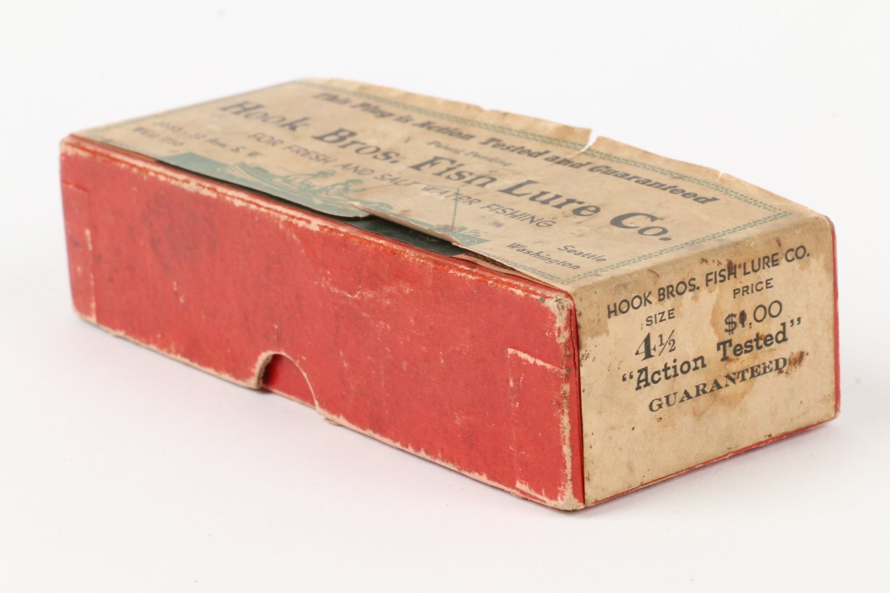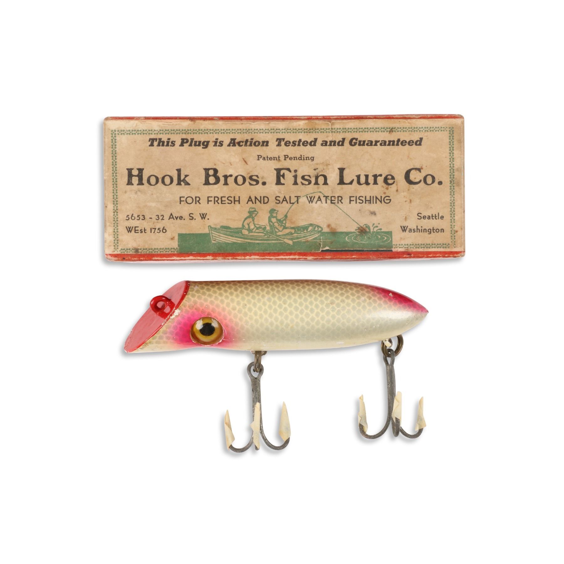 Hook Bros. Fish Lure Co., United States. Boxed. Material: Wood. Quantity: 1. Grade: VG. 5.5" box. Est. $75-100.