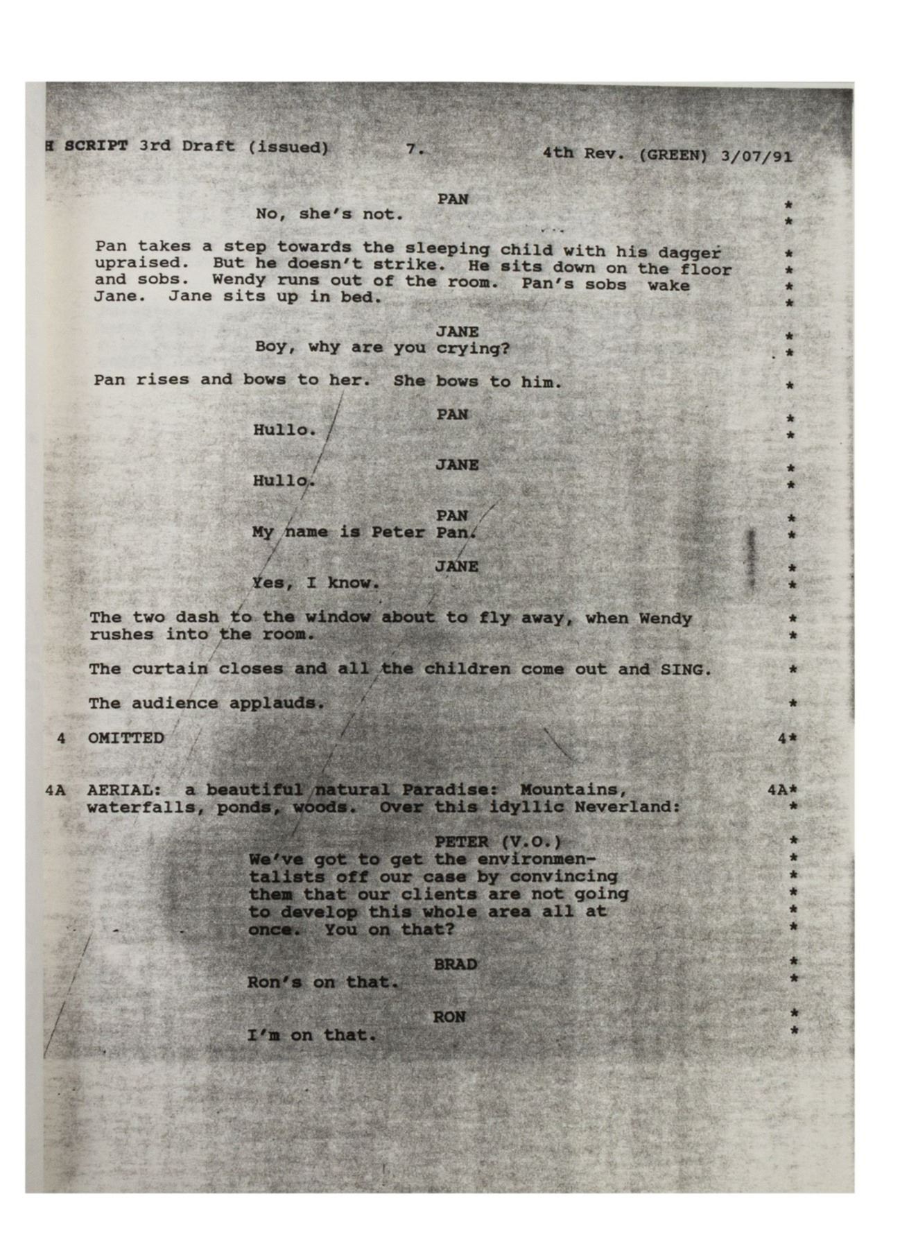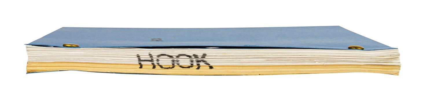 (TriStar, 1991) A script for Hook, starring Robin Williams. This 135-page script has multiple pages of revisions, and comes from the collection of Bill Wallen, who helped create promotional and advertising campaigns for the film. Measuring 11"x8.5", the script is in good condition with minor wear from use. Some of the pages are fairly dark from being photo copied.
