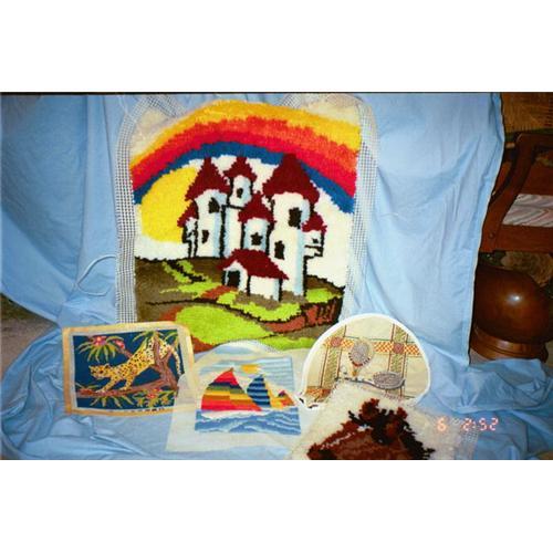 various sizes of unique child rugs, wall hangings and tennis cover. All in all 5 items complete this set of goodies....The hours it took to complete this set is stagering. You get to enjoy the completed craftwork of these lovely items.