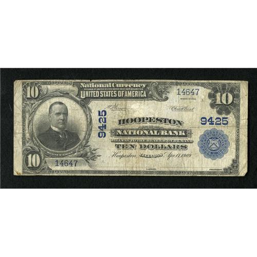 <B>Hoopeston, IL</B></I> - $10 1902 Plain Back Fr. 626 <B>Hoopeston NB</B></I> Ch. # 9425<BR>The note is nice and evenly worn. The scent of hand soap is present. <B>Very Good.</B></I><BR><I>From The Lincoln Collection</B></I><BR><BR><b>Shipping:</b> Coins & Currency (<a target="_blank" href="http://www.heritageauctions.com/common/shipping.php">view shipping information</a>)