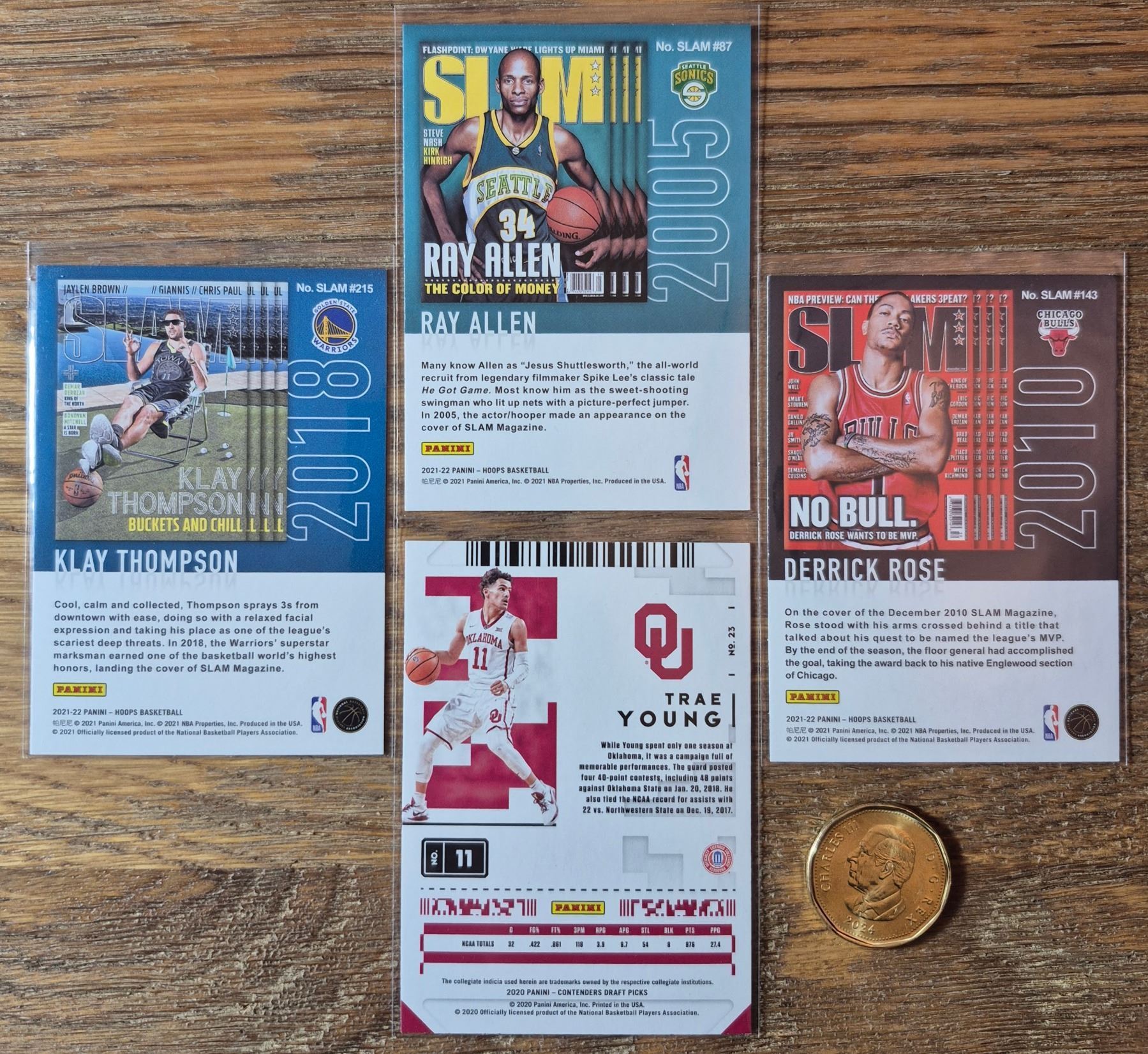 Klay Thompson, Ray Allen, Derrick Rose SLAM Inserts; Trae Young Contenders Prospect Ticket.
