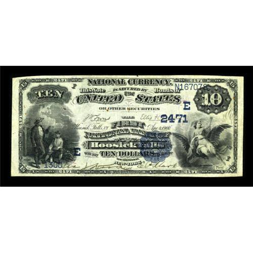 <B>Hoosick Falls, NY</B></I> - $10 1882 Date Back Fr. 545 <B>The First NB</B></I> Ch. # (E)2471<BR> A few pinholes are noticed on this example with nice pen signatures. This is only the second $10 Date Back reported on this bank which issued large size notes under the first title. <B>Fine-Very Fine.<BR></B></I><I>From The Walla Walla Collection</B></I><BR><BR><b>Shipping:</b> Coins & Currency (<a target="_blank" href="http://www.heritageauctions.com/common/shipping.php">view shipping information</a>)