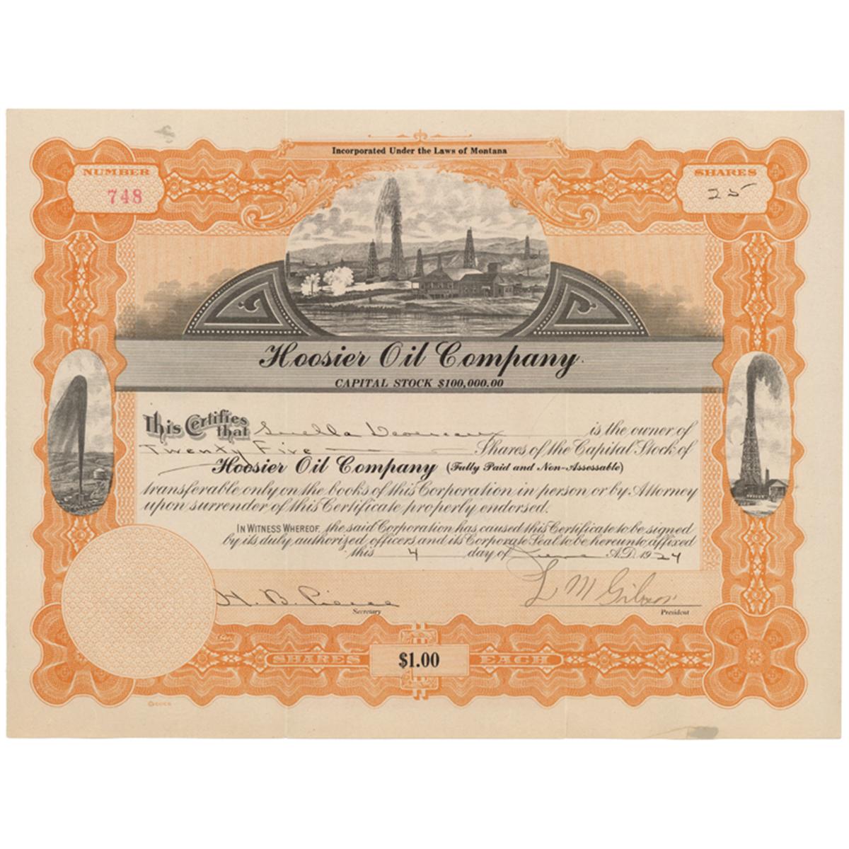 1925, Montana. Stock certificate for twenty-five shares. Orange / Black. Vignette of vignette of a oil operation with multiple derricks at top center. Vignette of gushing derricks at left and right center of border. Blind embossed company seal. Minor splits at lower edge of folds. Fine.