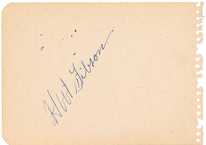 Rodeo champion and a pioneer cowboy film actor (1892–1962). Vintage ink signature, “Hoot Gibson,” on an off-white 6 x 4.25 album page. In fine condition, with a few stray ink marks and rough right edge from removal.