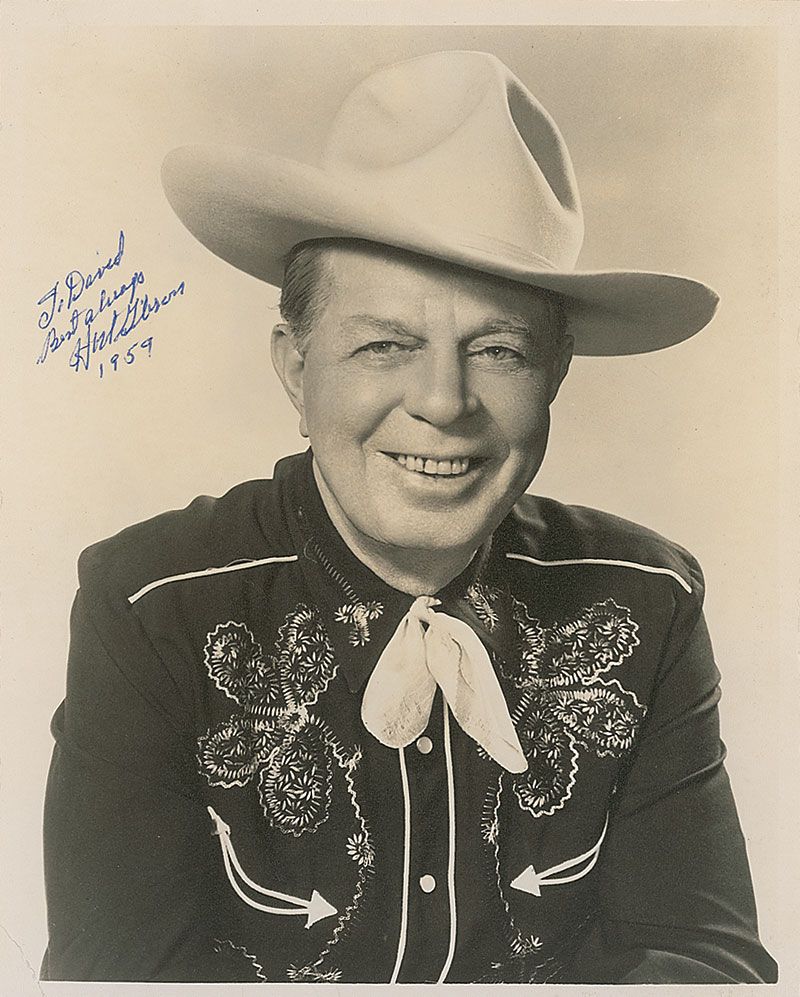 Vintage matte-finish 8 x 10 photo of Gibson in western garb, signed and inscribed in blue ballpoint, “To David, Best always, Hoot Gibson, 1959.” In fine condition.