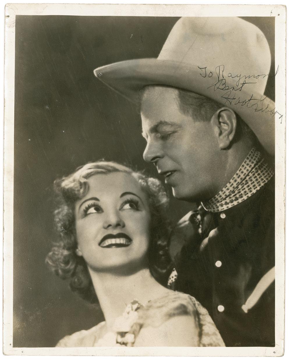 Vintage 8 x 10 photo of Hoot Gibson embracing Jane Gale, signed and inscribed in fountain pen “To Raymond, Best, Hoot Gibson.” The photo’s recipient, Raymond Bent, was the longtime projectionist at a popular movie theater in Welch, West Virginia, where many cowboy stars came to promote their movies. In very good condition, with scattered surface marks and dings, tack holes to each corner, and last name a shade light due to decreased ink flow. Pre-certified PSA/DNA and RRAuction COA.