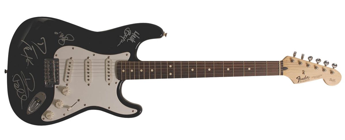 Black-bodied Fender Squier ‘stratocaster-style’ electric guitar, signed on the body in silver ink by Darius Rucker, Dean Felber, Jim ‘Soni’ Sonefeld, and Mark Bryan. In fine condition, with one missing string. Oversized.