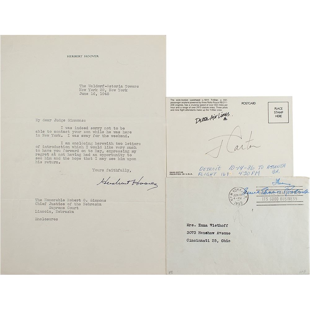 Three items signed by former occupants of the White House: a TLS by Herbert Hoover; a postcard signed by Jimmy Carter; and a free franked mailing envelope signed by Eleanor Roosevelt. In overall fine condition.