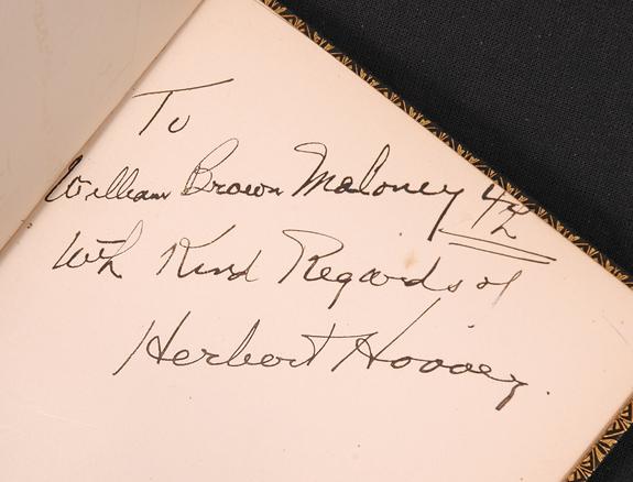 Hoover, Herbert. Handsome first edition hardcover book by Hoover, American Individualism inscribed and signed on an end page: "To William Brown Maloney With Kind Regards of Herbert Hoover," 1922. Bound in gilt, full navy morocco leather covers. Visually striking; separation of front cover with archival restoration.