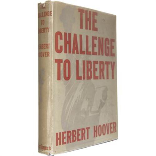 <B>Herbert Hoover: Inscribed and Signed </B></I><B><I>The Challenge to Liberty</B></I></B></I> (New York: Charles Scribner’s Sons, 1934), first edition, 212 pages, blue-cloth binding with gold lettering, 12mo (7.75” x 5.5”), dust jacket (in protective sleeve). <I>The Challenge to Liberty</B></I> was the first book written by prolific author Herbert Hoover following his presidency (1929-1933). He opens his introduction “For the first time in two generations the American people are faced with the primary issue of humanity and all government-the issue of human liberty,” then proceeds to compare the American system with the philosophies of fascism, socialism, Nazism, and communism. The front endpaper is inscribed and signed <I>“To Wallace Townsend / With Kind Regards of Herbert Hoover”</B></I>.<I> </B></I>The book is in very good condition with a small stain on the top left corner of the front cover; the dust jacket is in good condition with some chipping and a small stain on the back.<BR><BR><b>Shipping:</b> Books & Catalogs (<a target="_blank" href="http://www.heritageauctions.com/common/shipping.php">view shipping information</a>)