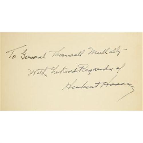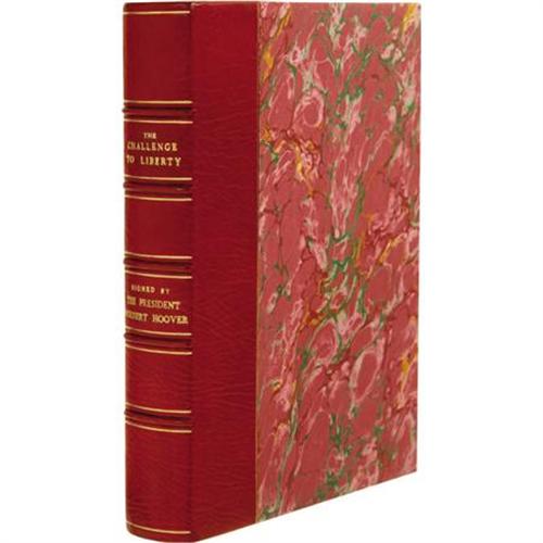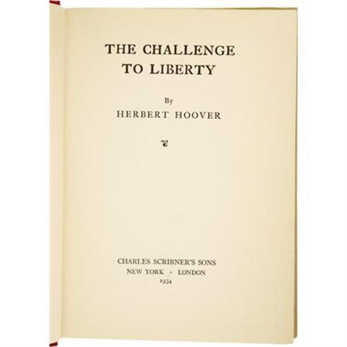 <B>Herbert Hoover: Signed First Edition of <I>The Challenge to Liberty</B></I>.</B></I> (New York & London: Charles Scribner's Sons, 1934), first edition ("A" and seal on copyright page), 212 pages, beautiful red cloth with gilt titles on the spine and the front board, 8vo (5.75" x 8"), dust jacket (in protective Mylar). Inscribed and signed "<I>To General Thornwall Mullally With the Kind Regards of Herbert Hoover</B></I>" on the front free endpaper. Hoover defends the American way of life against such threats as Fascism, Socialism, Naziism, and Communism in this impassioned book, his first communication to the American people since leaving the White House the year before. He also attacks a perceived loss of individual freedom under Franklin Roosevelt's New Deal policies, an idea shared my many Americans at the time. The book presented here is in very good condition, in a very good unclipped dust jacket, and comes housed in a custom red quarter leather slipcase with gilt spine lettering, five raised spine bands, and marbled boards.<BR><BR><b>Shipping:</b> Books & Catalogs (<a target="_blank" href="http://www.heritageauctions.com/common/shipping.php">view shipping information</a>)