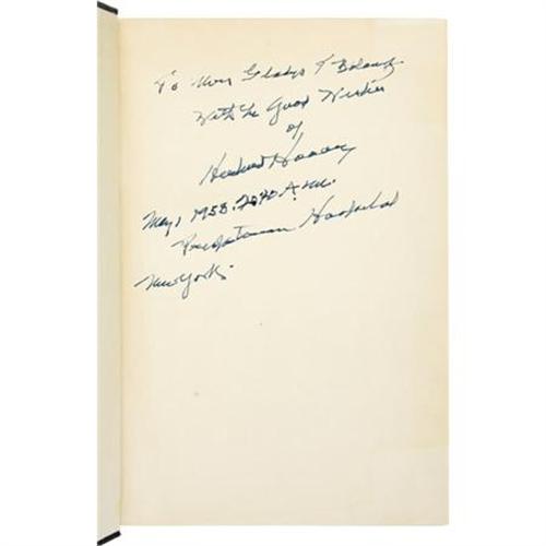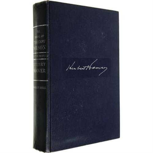 <B>Herbert Hoover Signed Book: </B></I><B><I>The Ordeal of Woodrow Wilson.</B></I></B></I> (New York: McGraw-Hill, 1958), first edition, 318 pages, illustrated, blue cloth with silver lettering on spine, 8vo (6.25" x 9.25"), signed and inscribed on the front free endpaper "<I>To Mrs. Gladys T Bolanz with the Good Wishes of Herbert Hoover May 1 1958…</B></I>". This book, when published, was a surprise to the literary world. Here was a former Republican president writing a book about one of his predecessors, a Democrat! To quote Hoover from this book: "...He was more than just an idealist: he was the personification of the heritage of the American people. He brought spiritual concepts to the peace table. He was a born crusader..." About very good condition, some minor staining on the cover, light shelfwear, and light soiling on edges.<BR><BR><b>Shipping:</b> Books & Catalogs (<a target="_blank" href="http://www.heritageauctions.com/common/shipping.php">view shipping information</a>)