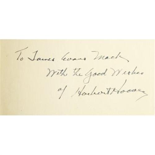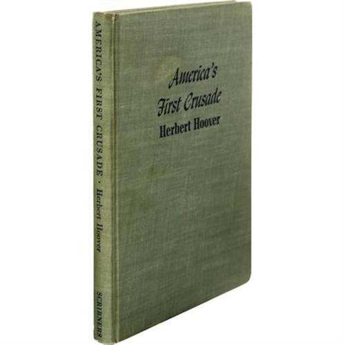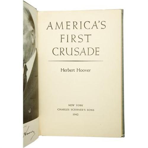 <B>Herbert Hoover: Signed Edition of <I>America's First Crusade</B></I>.</B></I> (New York: Charles Scribner's Sons, 1942), first edition, second printing, 81 pages, light blue cloth with navy blue lettering on the spine and front board, 8vo (5.5" x 8.25"), no dust jacket. Inscribed and signed "<I>To James Evans Mack With the Good Wishes of Herbert Hoover</B></I>" on the front free endpaper. Here, Hoover writes of America's involvement in the First World War, and of his philanthropic relief efforts in war-torn Europe. The book is in very good condition with moderate shelf wear, and two very minor stains on the front board. The binding is tight and the textblock only slightly toned in this fascinating inside peek at America and World War I.<BR><BR><b>Shipping:</b> Books & Catalogs (<a target="_blank" href="http://www.heritageauctions.com/common/shipping.php">view shipping information</a>)
