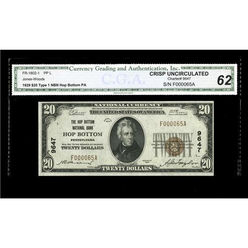 <B>Hop Bottom, PA</B></I> - $20 1929 Ty. 1 <B>The Hop Bottom NB</B></I> Ch. # 9647<BR>A high grade example bearing a most sought after town name. CGA has slabbed this as <B>Crisp Uncirculated 62.</B></I>