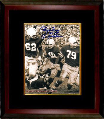 Hopalong Cassady played for the Ohio State Buckeyes from 1952-55. During his college career, he scored 37 touchdowns in 36 games. He also played defensive back; a pass was never completed on him in his four years at the university. In 1955, Cassady won the Heisman Trophy (by the largest margin at the time), the Maxwell Award, and was named the Associated Press Athlete of the Year. Hopalong Cassady has hand autographed this Ohio State Buckeyes Sepia Tone 8x10 Photo. Certificate of Authenticity from Athlon Sports. Custom Black Mat and Premium Mahogany Frame as shown.