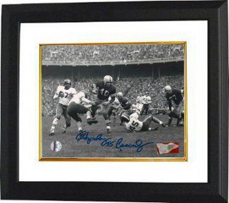 Hopalong Cassady played for the Ohio State Buckeyes from 1952-55. During his college career, he scored 37 touchdowns in 36 games. He also played defensive back; a pass was never completed on him in his four years at the university. In 1955, Cassady won the Heisman Trophy (by the largest margin at the time), the Maxwell Award, and was named the Associated Press Athlete of the Year. Hopalong Cassady has hand autographed this Ohio State Buckeyes B&W 8x10 Photo with 55 inscription. Cardboard Heroes Hologram and Certificate of Authenticity from Athlon Sports. Custom White Mat and Premium Black Frame as shown.