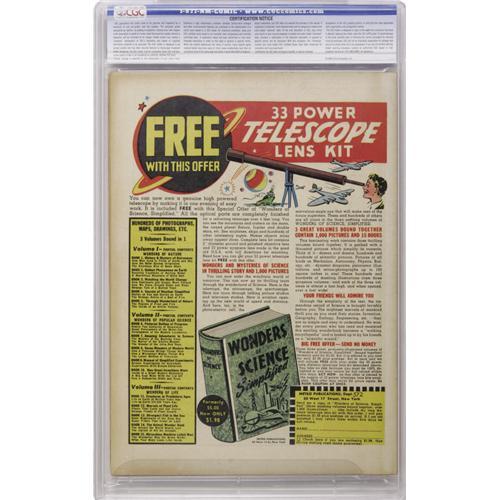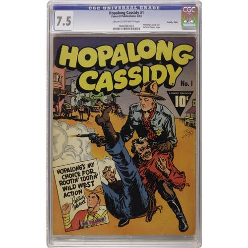 <B>Hopalong Cassidy #1 Crowley Copy pedigree (Fawcett, 1943) CGC VF- 7.5 Cream to off-white pages.</B></I> Hopalong gets the thumbs up from Captain Marvel on the action-packed, line-drawn cover of this pedigree offering. Hopalong and his horse Topper began their series run with this first issue. One of the most successful western comics ever published, <B>Hopalong Cassidy</B></I> enjoyed a 16-year run, initially under Fawcett Publishing until DC acquired the title in 1954. Overstreet 2006 VF 8.0 value = $3,311. CGC census 10/06: 2 in 7.5, 3 higher.<BR><BR><b>Shipping:</b> Slabbed Comic (<a target="_blank" href="http://www.heritageauctions.com/common/shipping.php">view shipping information</a>)