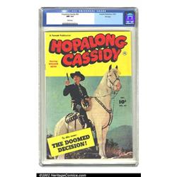 Hopalong Cassidy #62 File Copy (Fawcett, 1951) CGC NM 9.4 White pages. This is a gorgeous copy of the movie- and TV-based comic, with a photo cover of Hoppy and Topper. CGC has graded only one copy of this issue to date, and it will be hard to beat! Overstreet 2002 NM 9.4 value = $70. Important notice: We expect to be auctioning lots at the rate of 200-250 per hour. Sometimes eBay Premier live bid software cannot keep up with that pace, so we strongly recommend that you place a realistic proxy bid now as insurance to avoid disappointment. Also please note that all Heritage/CAA lots purchased through eBay Premier carry a 20% Buyer's Premium. Please make sure you read the Terms and Conditions.