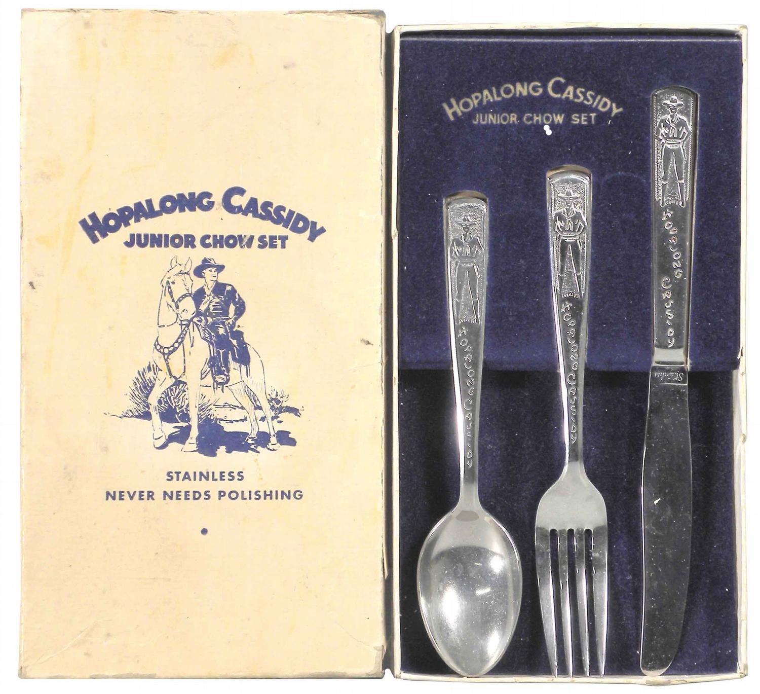 Hopalong Cassidy Junior Chow Set. No. Imperial Knife Co. Providence, RI. No. HC-2, 1950. Comes in original box. Box has is in fair condition with tears and staining, set in like new condition.